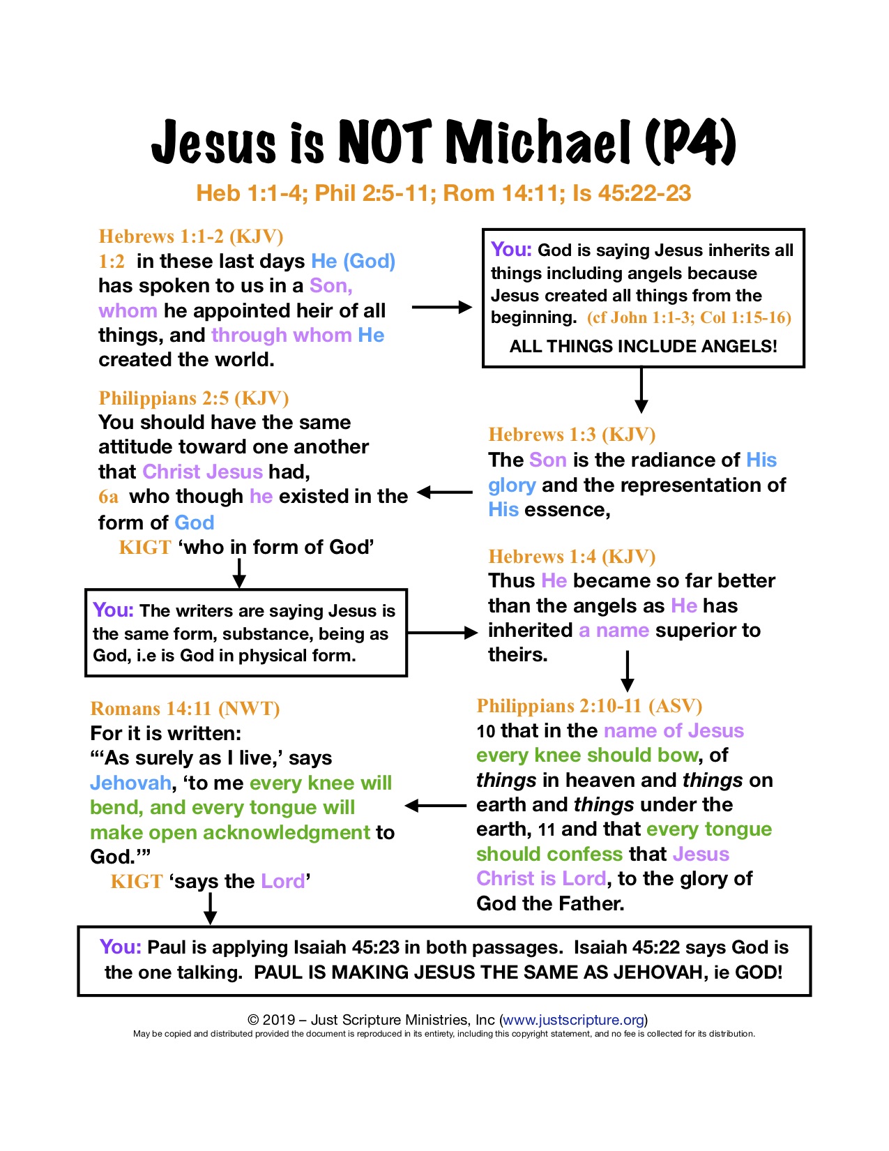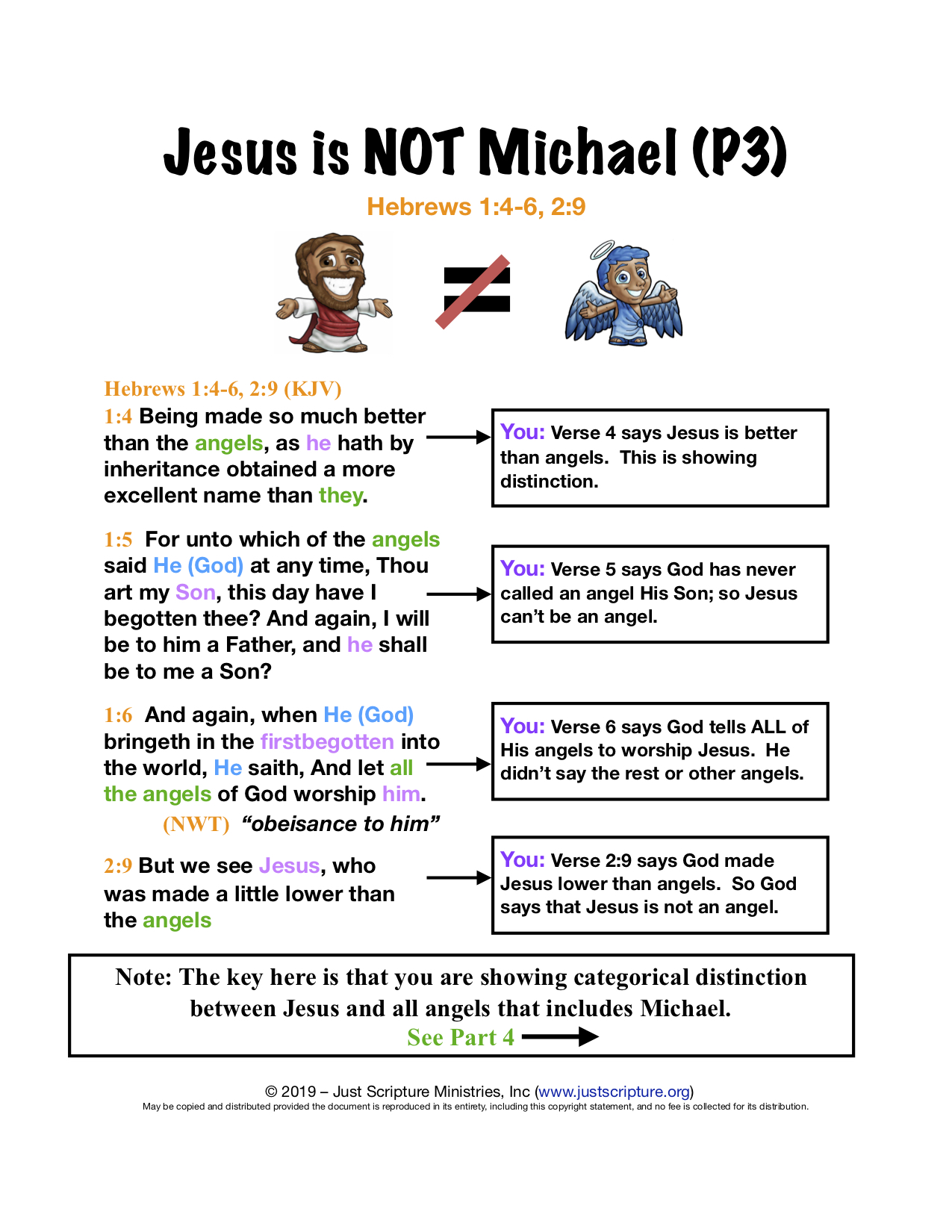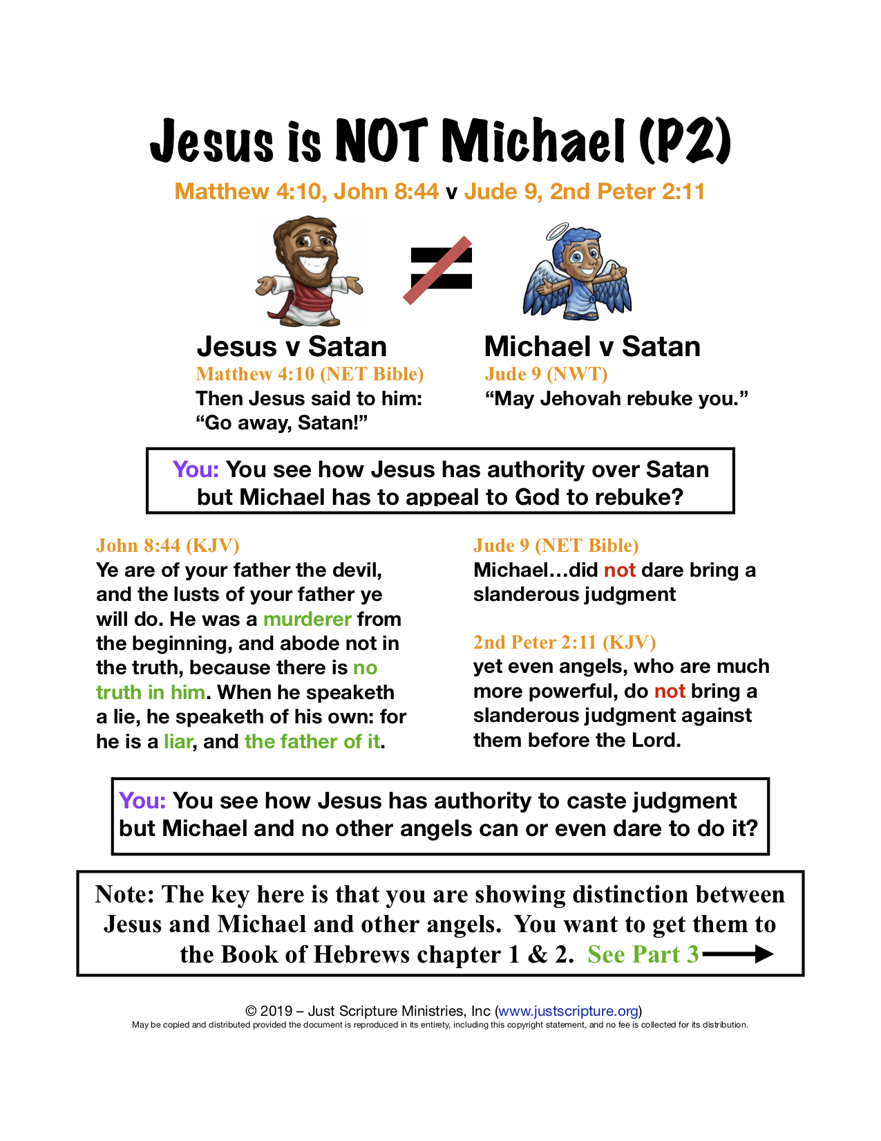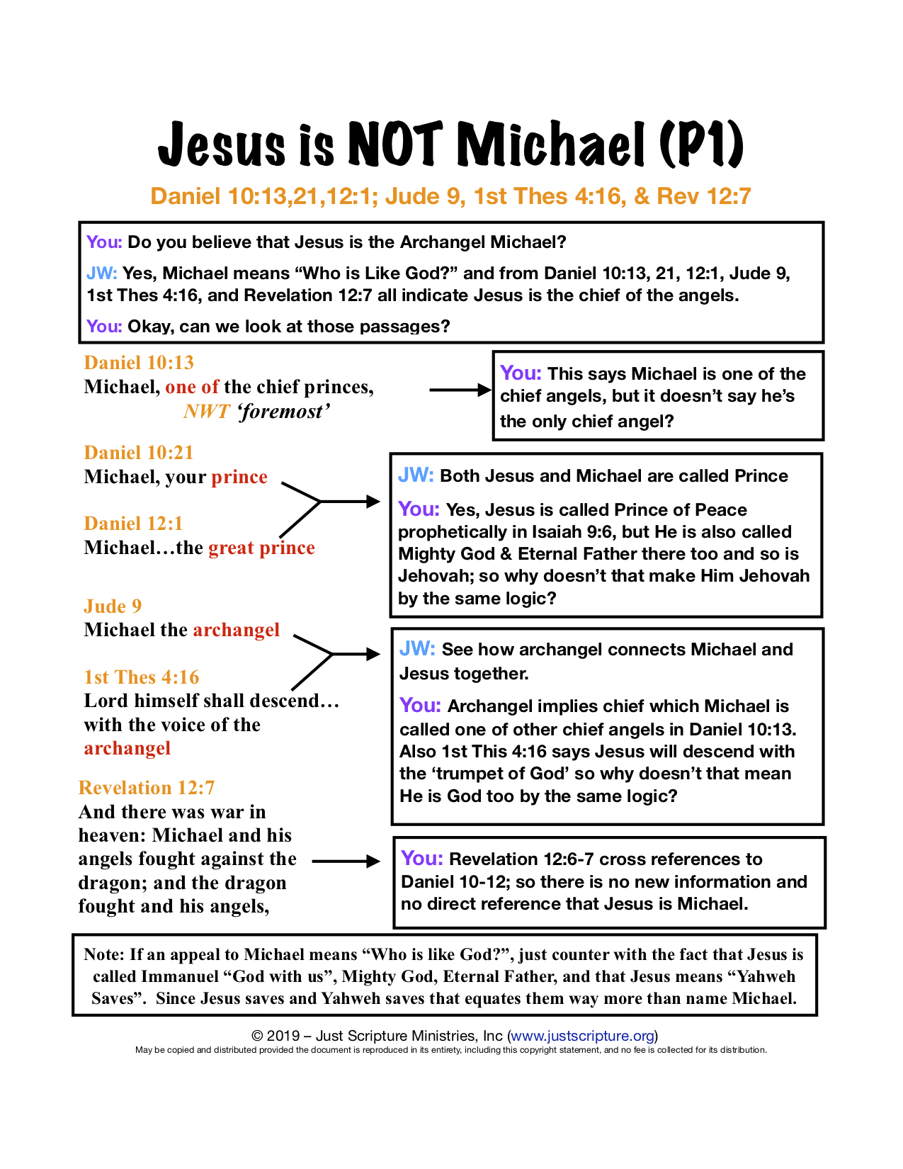 This video refutes the Jehovah's Witnesses false claim that Jesus is the Archangel Michael. They claim Jesus is a created 'spirit person' and since Michael means "who is like God?" that this indicates Jesus is just the physcial recreation of the Archangel Michael.
