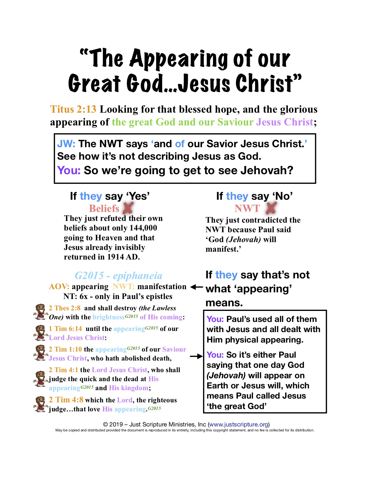 In this video, we demonstrate how to put JWs in a catch-22 with Titus 2:13 that states "Looking for that blessed hope, and the glorious appearing of the great God and our Saviour Jesus Christ;"