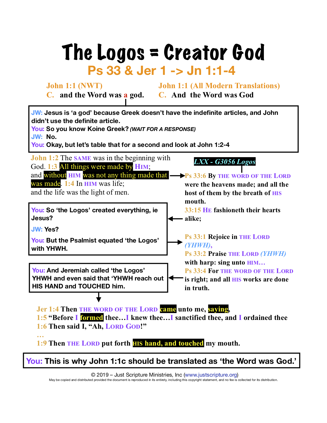 In this video, you'll learn how to respond to a JWs when they argue that John 1:1c should be translated "the Word was a god" instead of "the Word was God." The NWT places the indefinite article in front of Theos because it stands in direct opposition to their Unitarian belief that Jesus is a created being and not Almighty God.