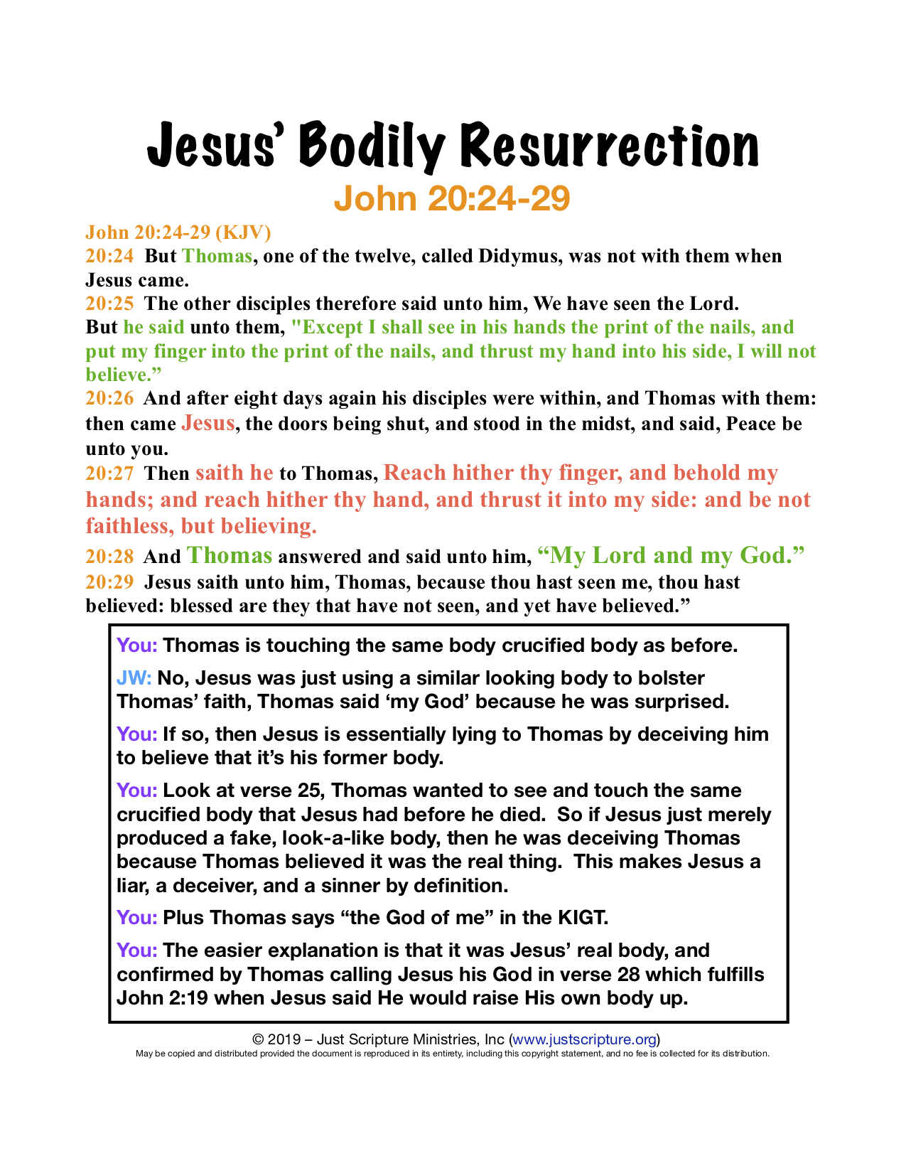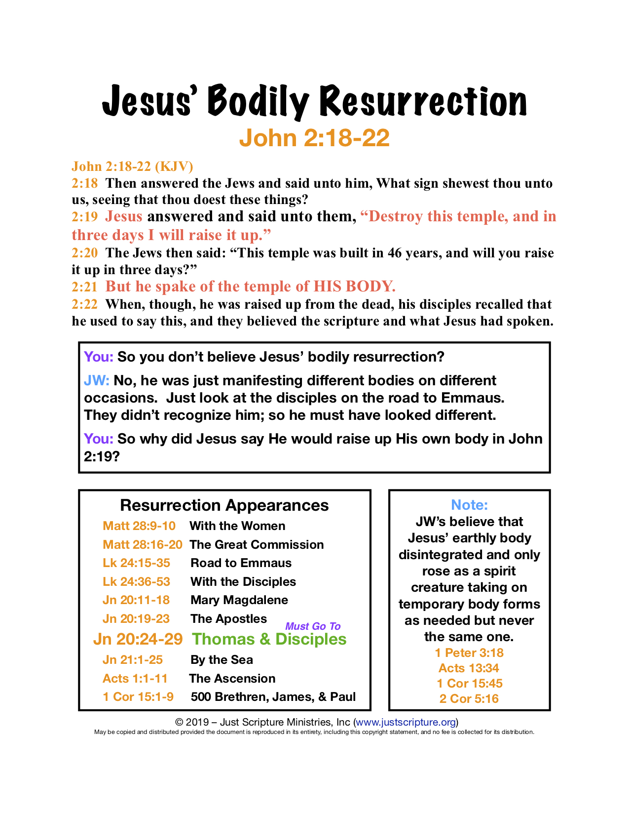 This video demonstrates how John 2:18-22 & 20:24-29 refutes all Jehovah's Witnesses beliefs about Jesus' death & resurrection and their denial of His Deity nature and of the Trinity.